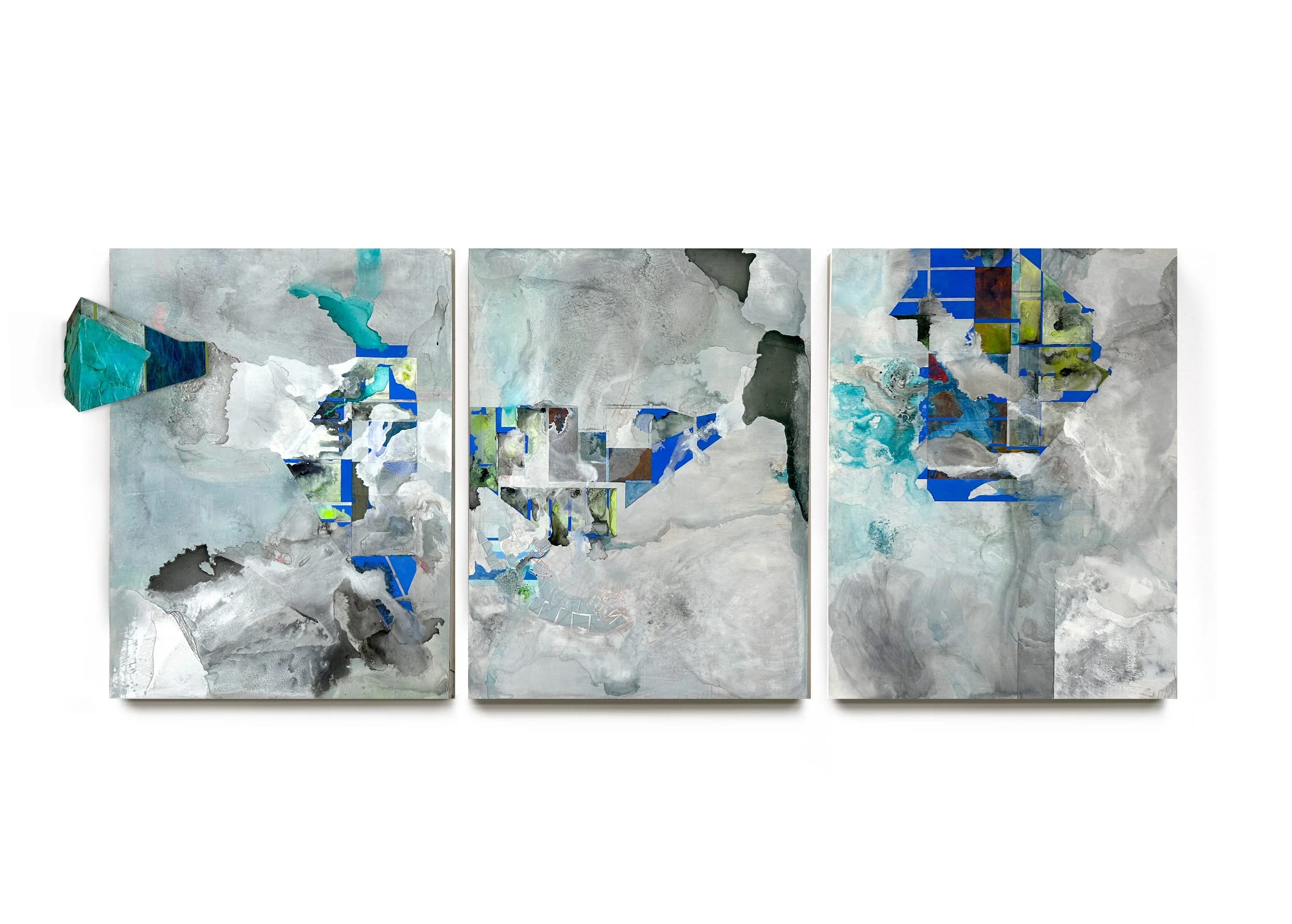 Hughen/Starkweather, Spare one, strike another, 52 x 84 inches, Acrylic paint, ink, gouache, graphite, sand, dirt, and river water on paper and wood panel triptych, 2025