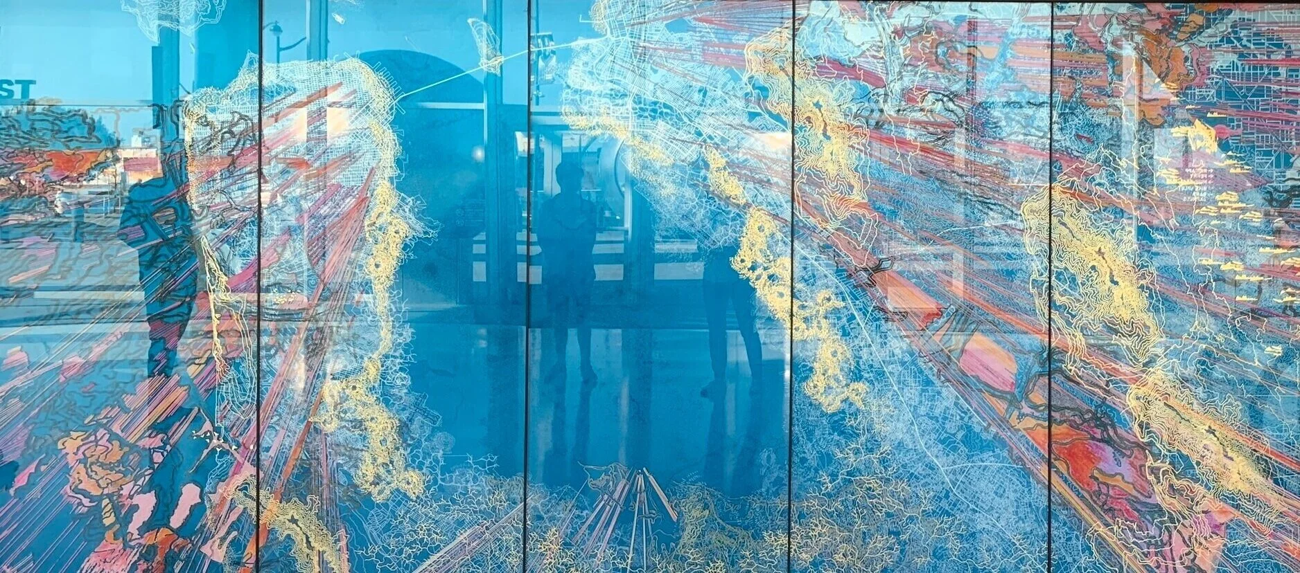 21 foot wide artwork is layered ink, gold leaf, glass, and aluminum