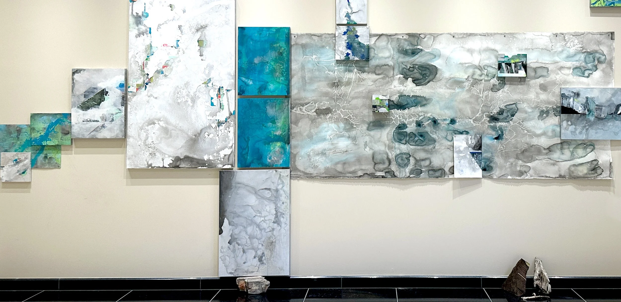 Hughen/Starkweather, Interwoven Terrains, 2024, acrylic paint, ink, gouache, sand, dirt, borax, graphite, and river water on wood panel; enamel on bronze, 80 x 197 x 4 inches
