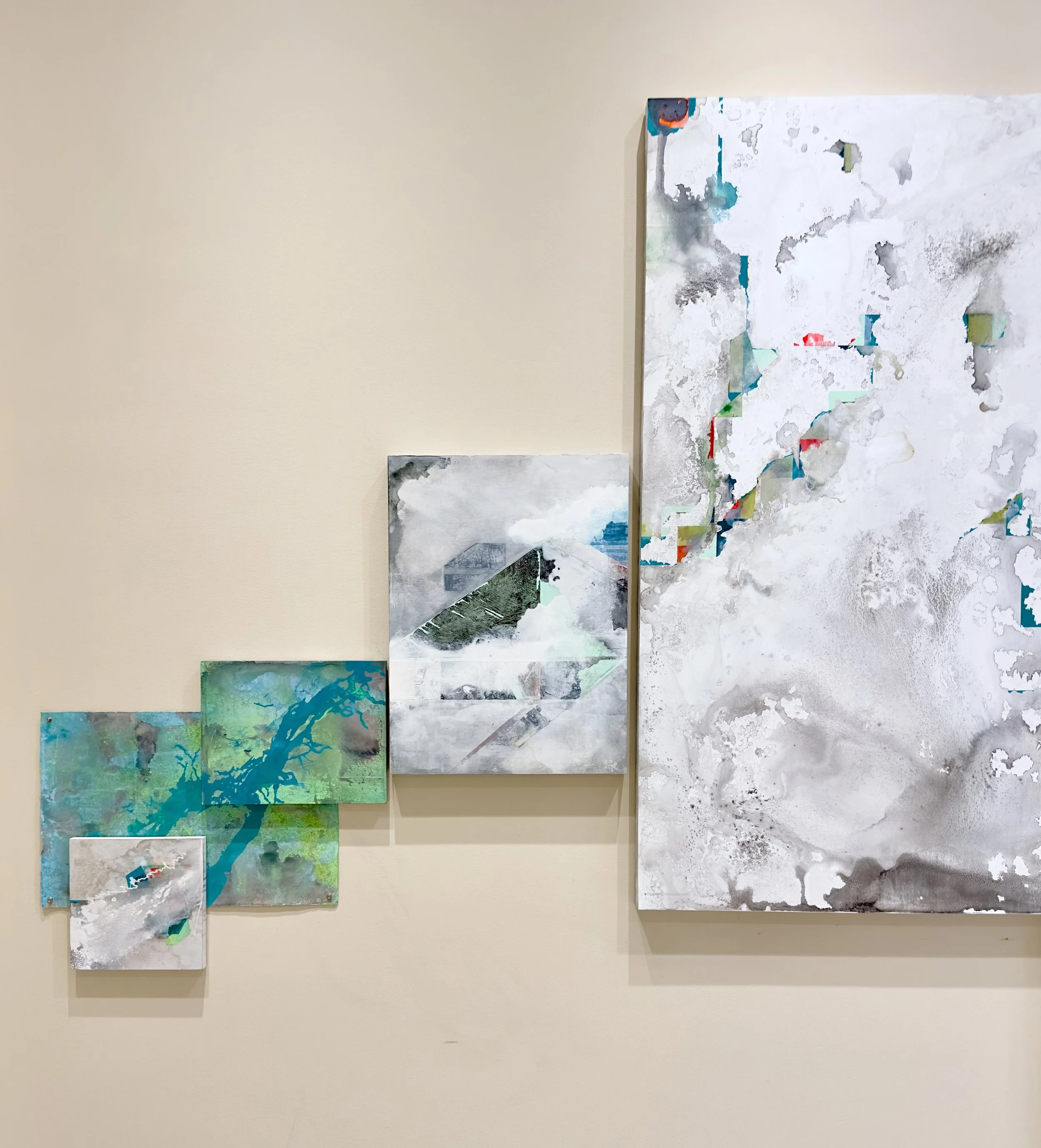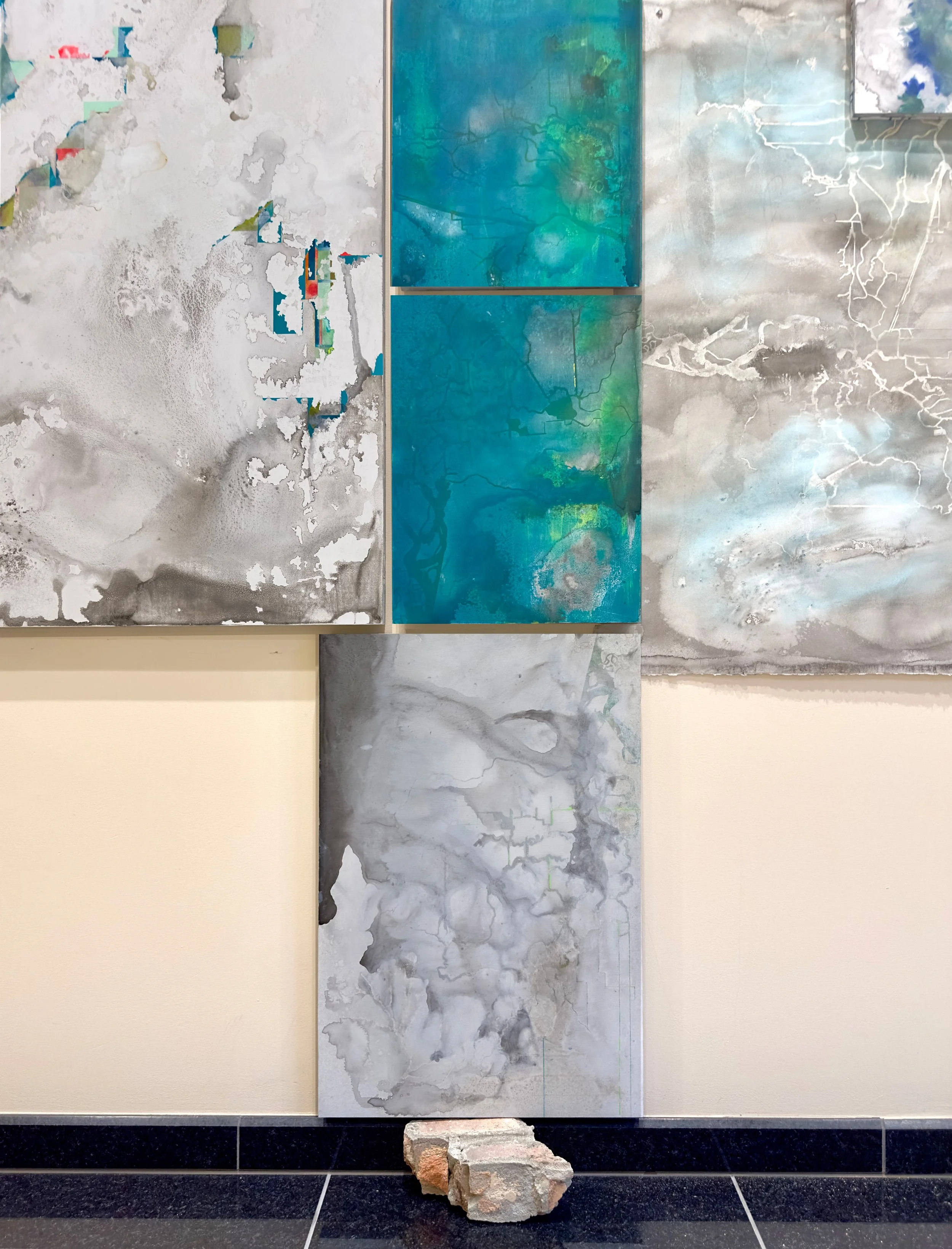 Hughen/Starkweather, Signs of Recovery, 2024, acrylic paint, ink, sand, salt, gouache, bay water, and paper on wood panel, 14 x 11 x 1 inches