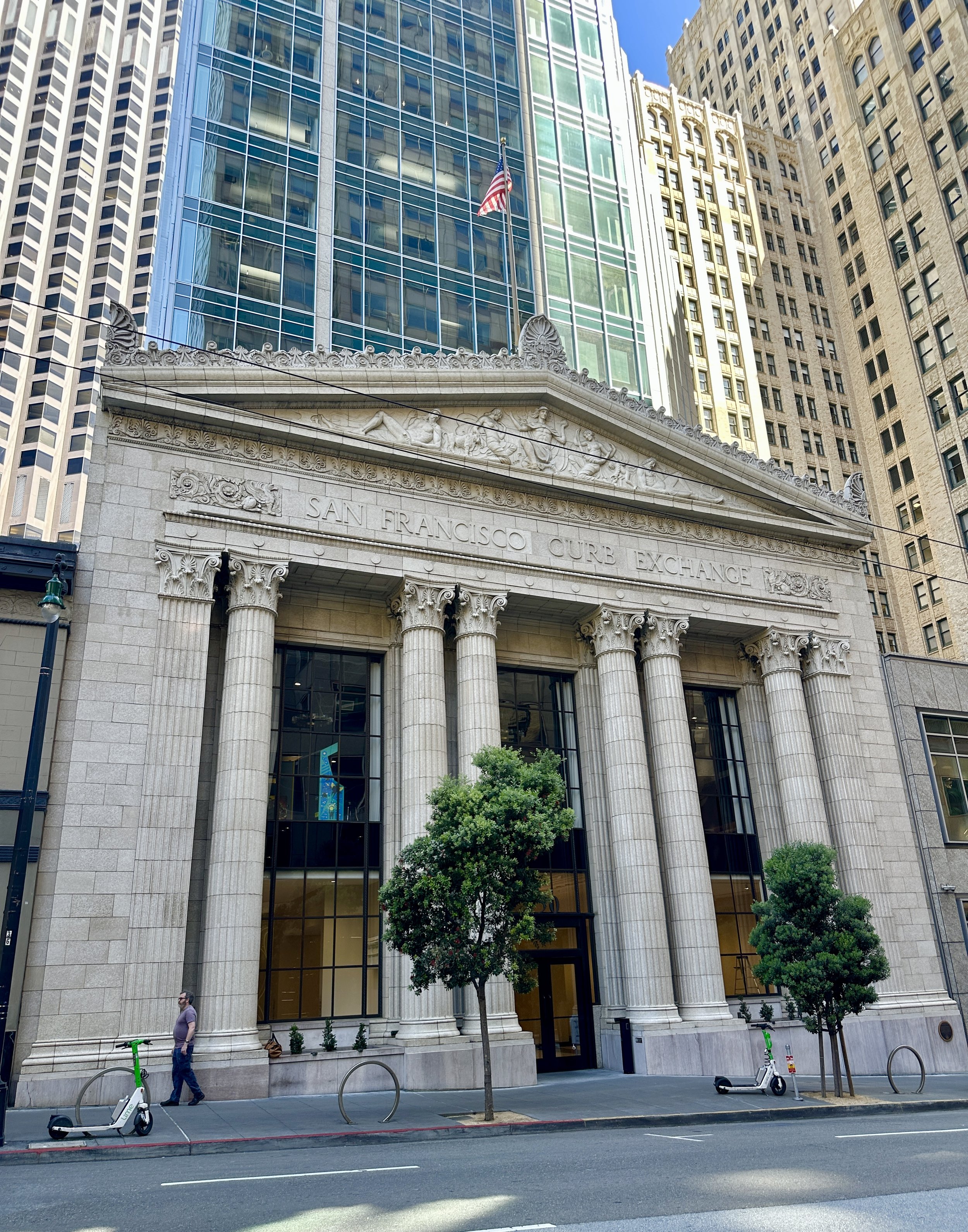 The historic Mining Exchange building in downtown San Francisco. Water As Currency sound and visual installation responds to this site and its histories and futures of resource trading, technology, and innovative green solutions