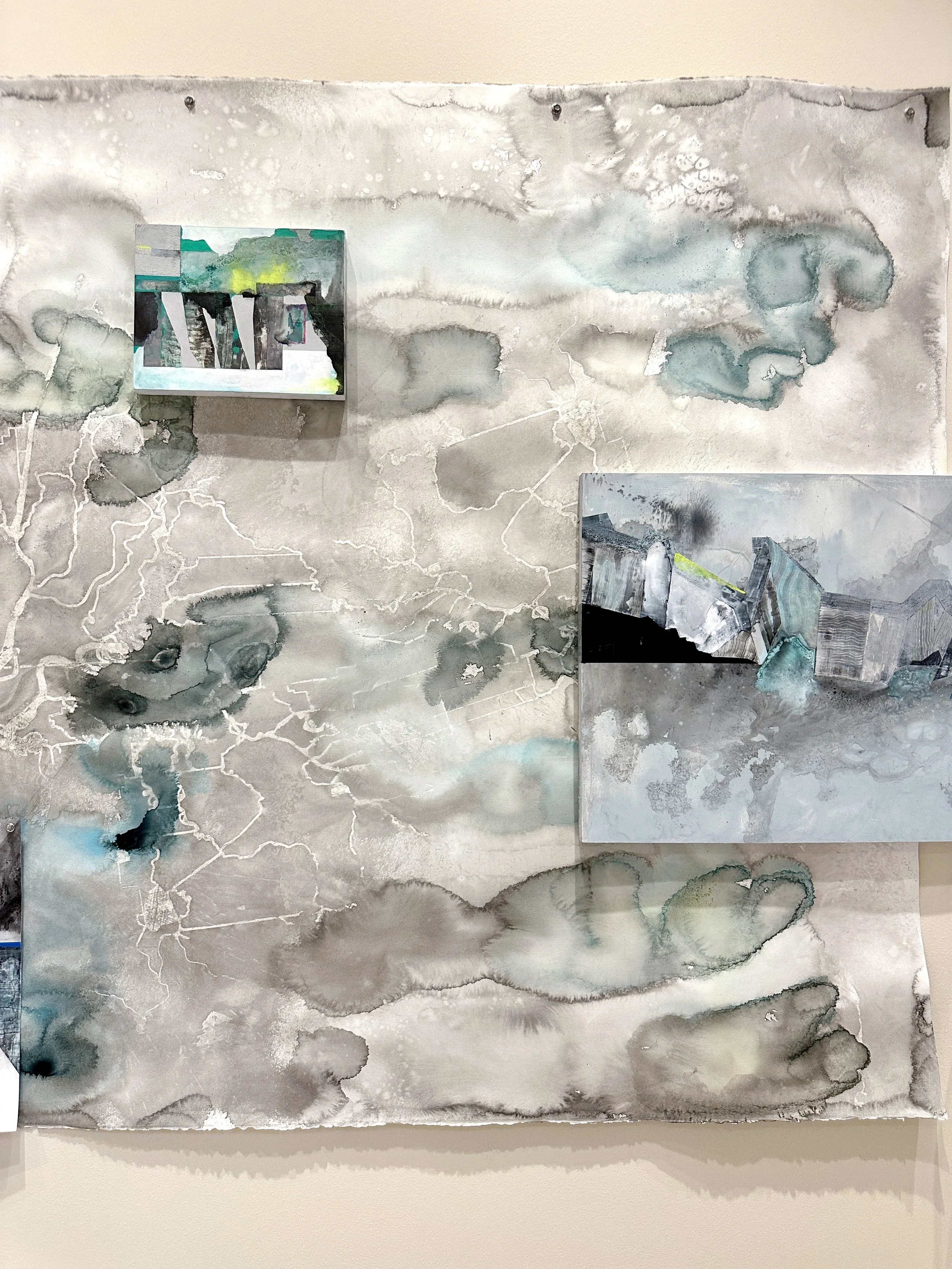 Hughen/Starkweather, Sand, Shale, Oil, Watershed, 2025, Acrylic paint, gouache, river water, ink and paper on wood panel, 8 x 10 x 1 inches